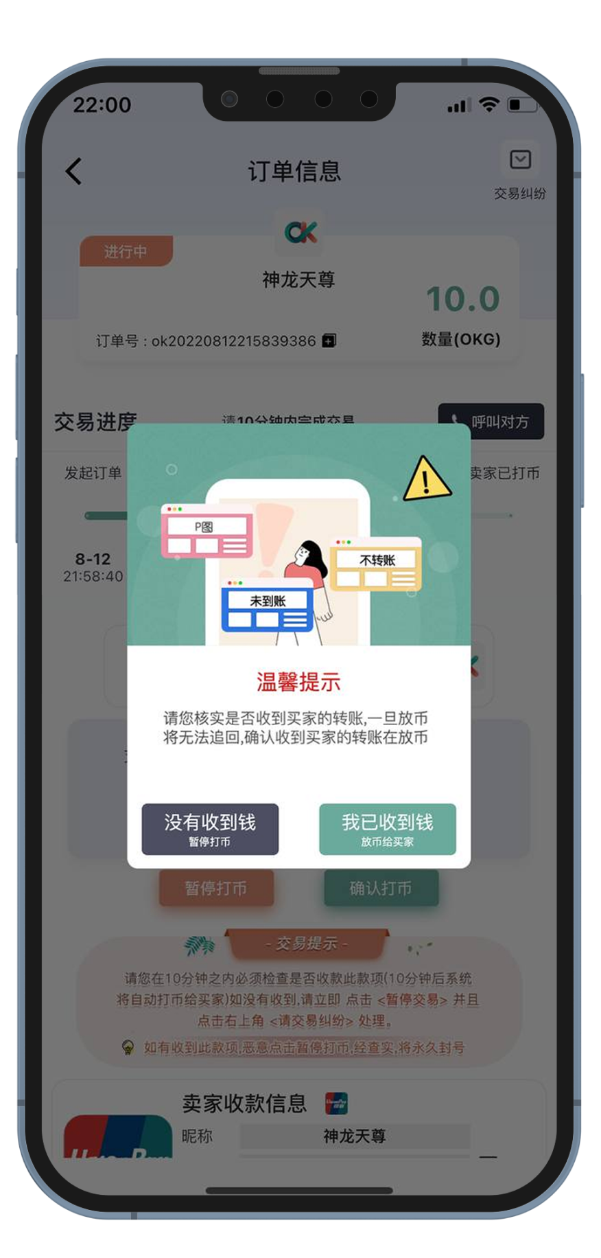 核实买家转账金额无误以后 请点击我已收到钱放币给买家 卖币交易完成